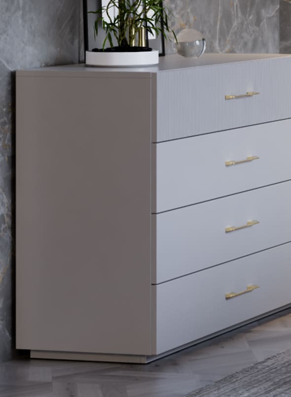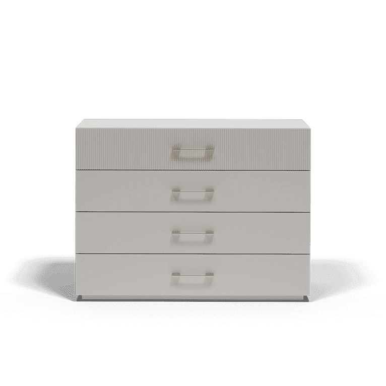 Forma sa compactă și simetrică este evidențiată de sertarele perfect aliniate, dintre care primul iese în evidență printr-o textură verticală fină. Această striație adaugă ritm vizual și diferențiere, fără a ieși din linia unui design minimalist. Mânerele elegante, metalice, sunt proporționate exact cât trebuie pentru a păstra simplitatea formei.