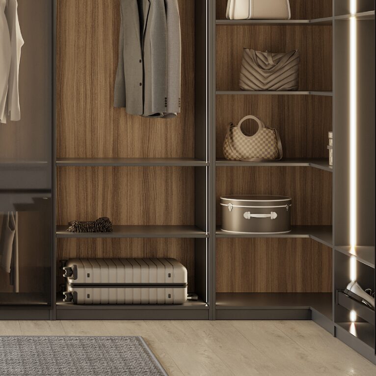 INTERIO se bazează pe un sistem flexibil, format din 18 modele de bază, corpuri superioare (antresoale) și sertare interioare care permit zeci de variante de configurare. Dimensiunile pot fi personalizate integral, iar modulele se combină în funcție de spațiul disponibil: de la dressinguri mari, walk-in, până la soluții compacte pentru dormitoare, holuri sau garsoniere.